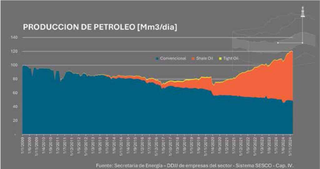 Vaca Muerta: epicentro del boom energético. La formación Vaca Muerta consolida su liderazgo como el núcleo del desarrollo no convencional en Argentina. En diciembre de 2024, su producción de petróleo alcanzó los 71,1 Mm³/d, un 27,4% más que el año anterior.
