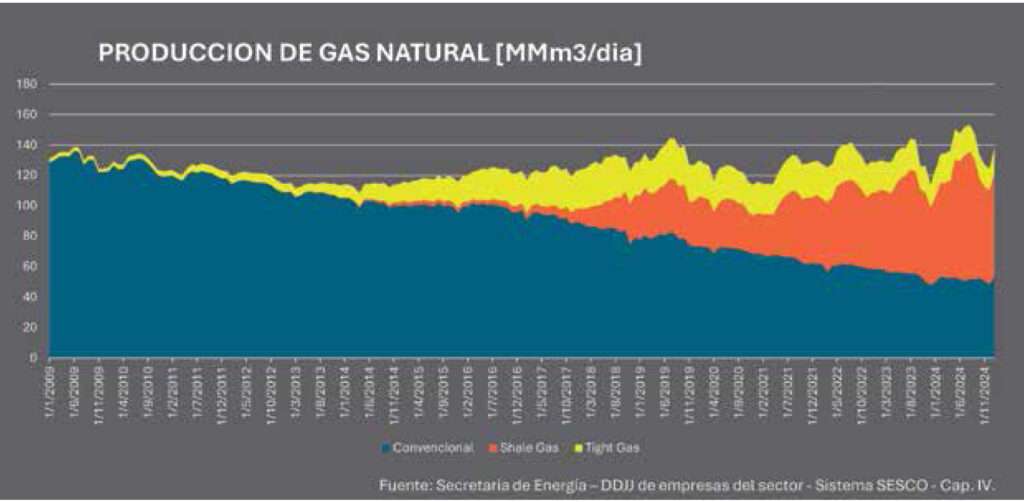 El gas no convencional representó el 61% de la producción total en diciembre de 2024, con un aumento del 13,4% interanual, impulsado especialmente por el shale (+20,3%). El gas convencional y el tight muestran un descenso del 6,4% y 6,7% respectivamente.